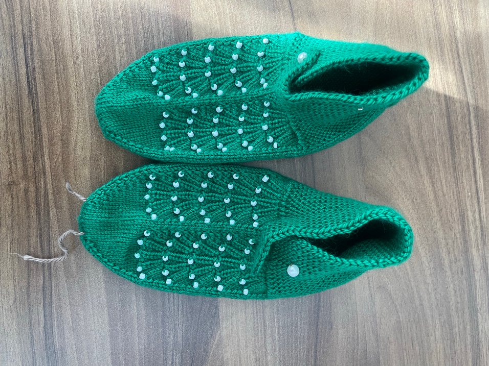 Yeşil renkli, örgü dokulu, işlemeli detaylara sahip kadın patiği Konforlu ve renkli tasarımıyla günlük kullanıma uygundur. Beş şiş ile işlenmiştir