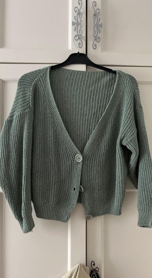 Yeşil renk, örgü kumaştan, uzun kollu, salaş kesim kadın hırka. Midi boyda, rahat ve günlük kullanım için uygun.