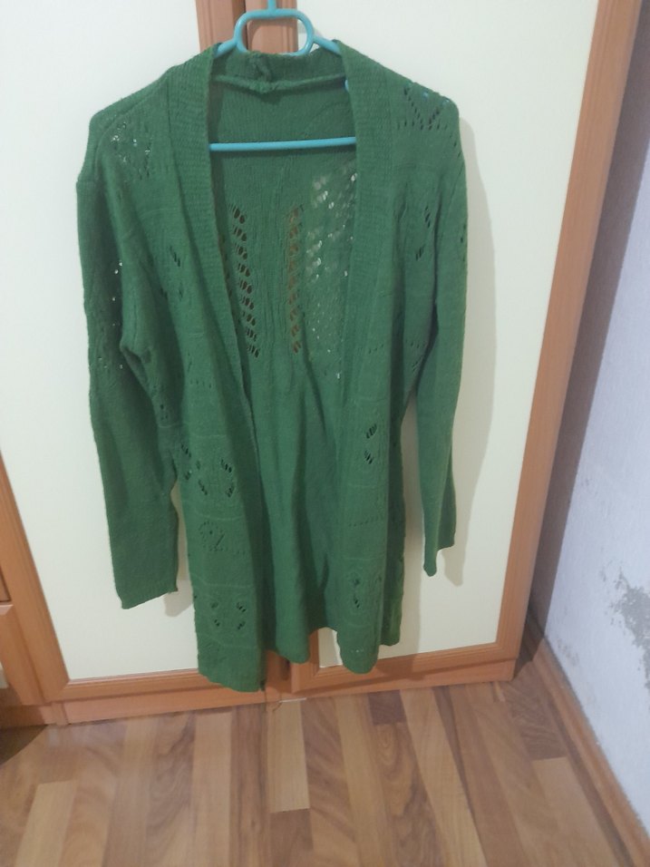 Koyu yeşil renkli, uzun kollu, notched lapel yakalı, midi boy, bol kesim örgü kadın hırka. Bohem tarzda, günlük kullanım için uygun.