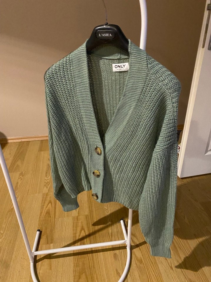 Yeşil renk, örgü kumaştan yapılmış kadın hırka. Notlu yaka ve uzun kolludur, rahat ve midi boydadır. Günlük kullanıma uygundur.