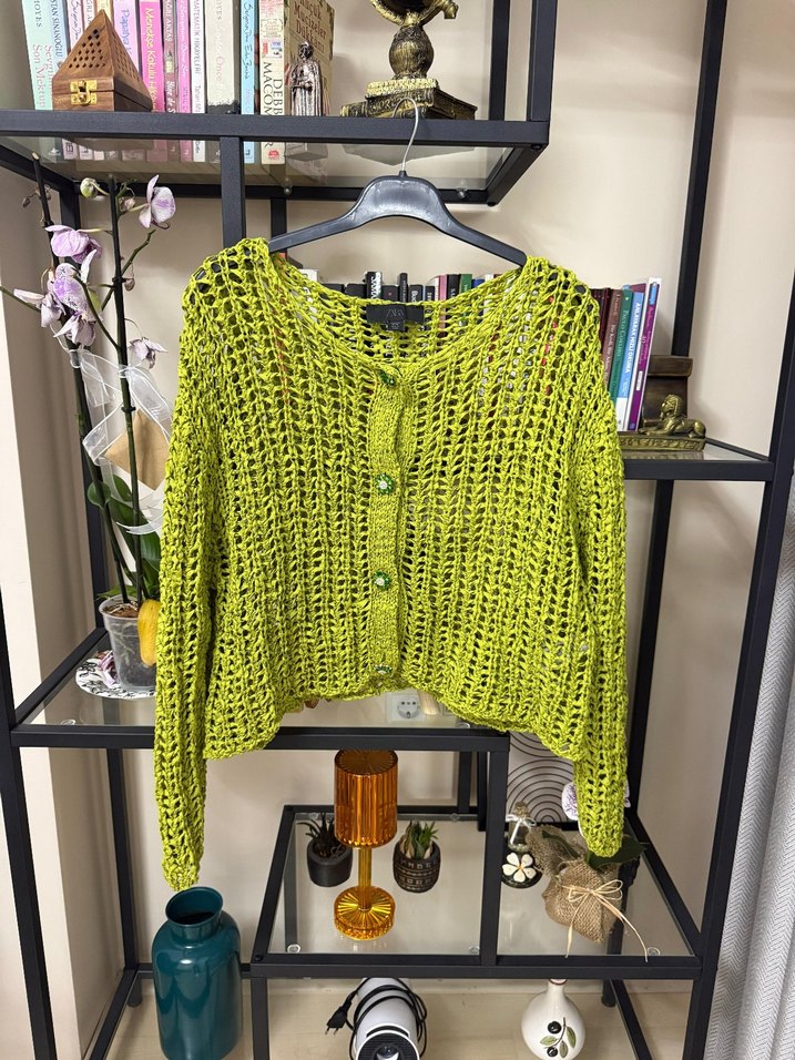 Yeşil renkli, örgü dokulu, bol kesim uzun kollu ve yuvarlak yaka kadın hırka. Bohem tarzı ve midi boyuyla günlük kullanıma uygundur. orjinal sorunu yok