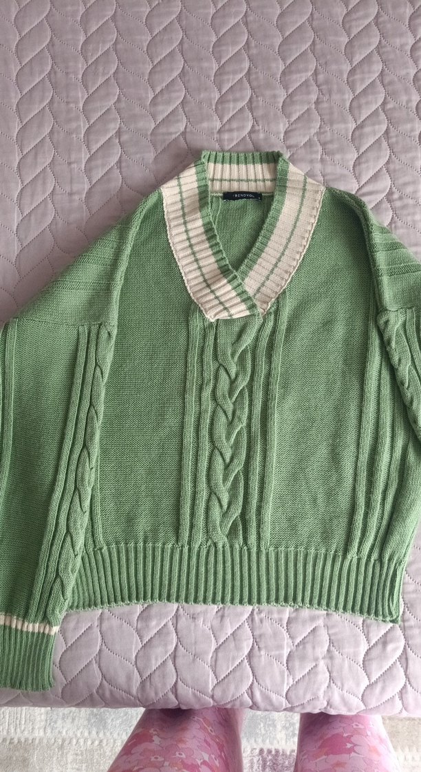 Bu yeşil örgü kadın kazak, uzun kollu ve bol kesimdir. Yumuşak örme kumaştan yapılmıştır ve günlük kullanım için uygundur.