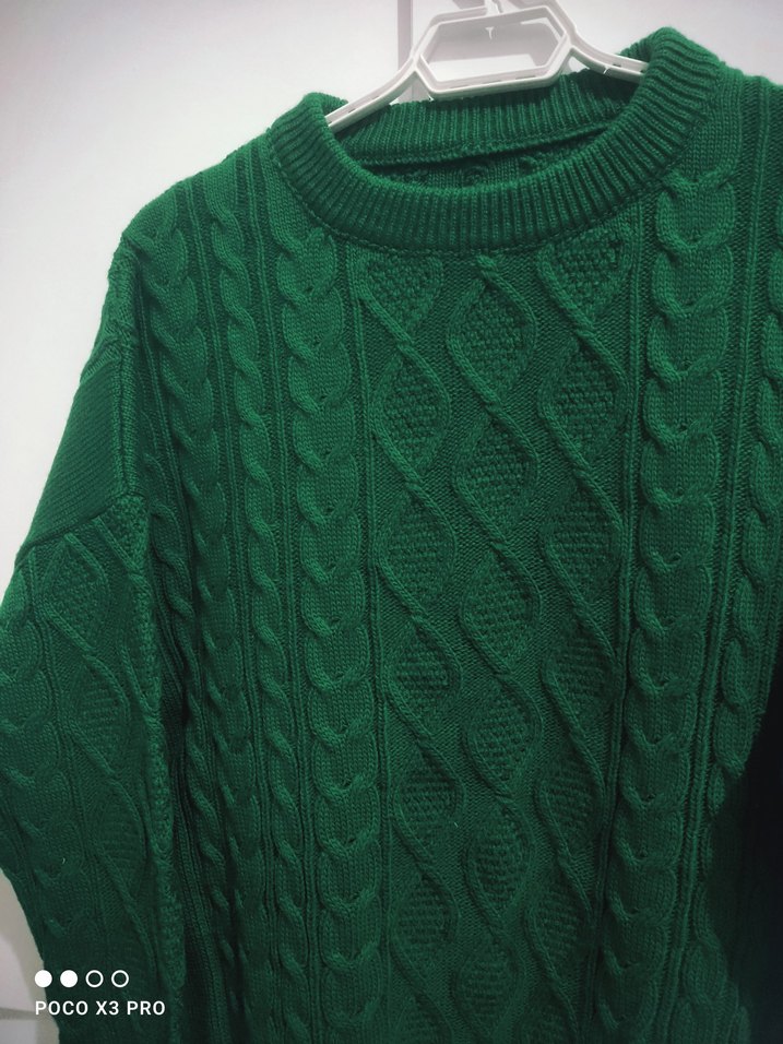 Yeşil renkli, örgü kumaştan yapılmış, yuvarlak yaka ve uzun kollu, bol kesim kadın kazak. Midi boyda, günlük kullanıma uygun rahat bir model.