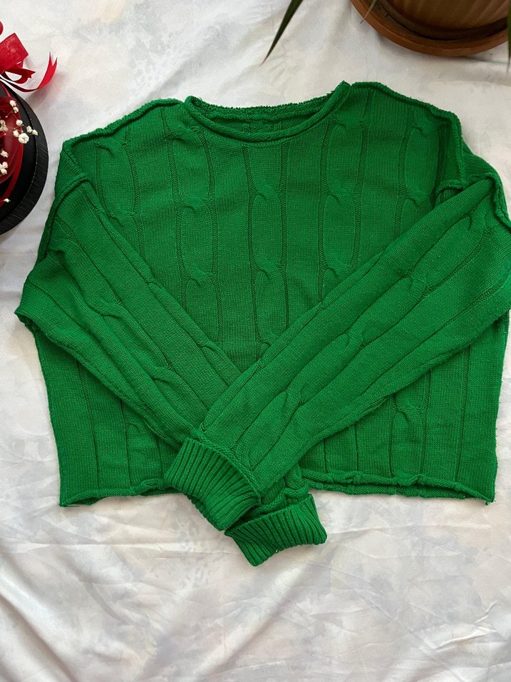 Yeşil renkli, örgü kadın kazak; uzun kollu, bisiklet yaka ve normal midi boydadır. Rahat ve şık, günlük kullanıma uygundur.
