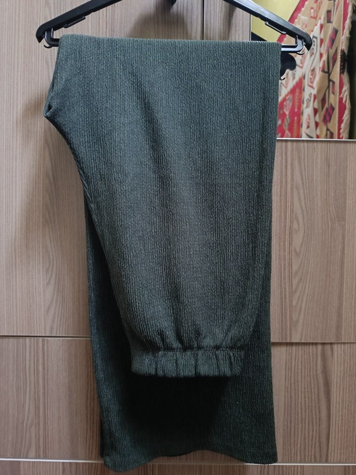 yeşil örgü keten kumaştan, midi boy, bol kesim kadın pantolon. Rahat ve şık, günlük kullanım için uygun.