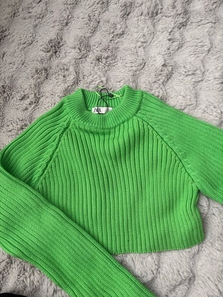 Bu yeşil, örgü kısa kazak, uzun kollu ve yuvarlak yakalıdır. Rahat, sıkı oturan örgü kumaştan yapılmıştır ve gündelik sokak stiline uygundur. Croptur