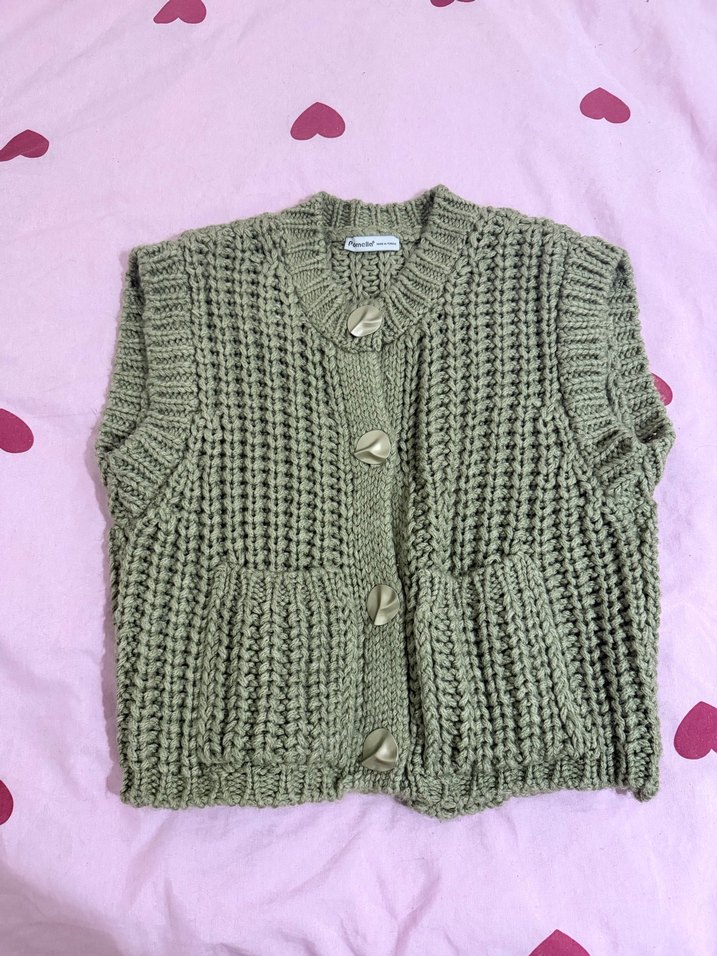 Yeşil renkli, örgü kadın süveter, rahat kesimli ve yuvarlak yaka. Kolsuz ve sade tasarımıyla günlük kullanıma uygundur.