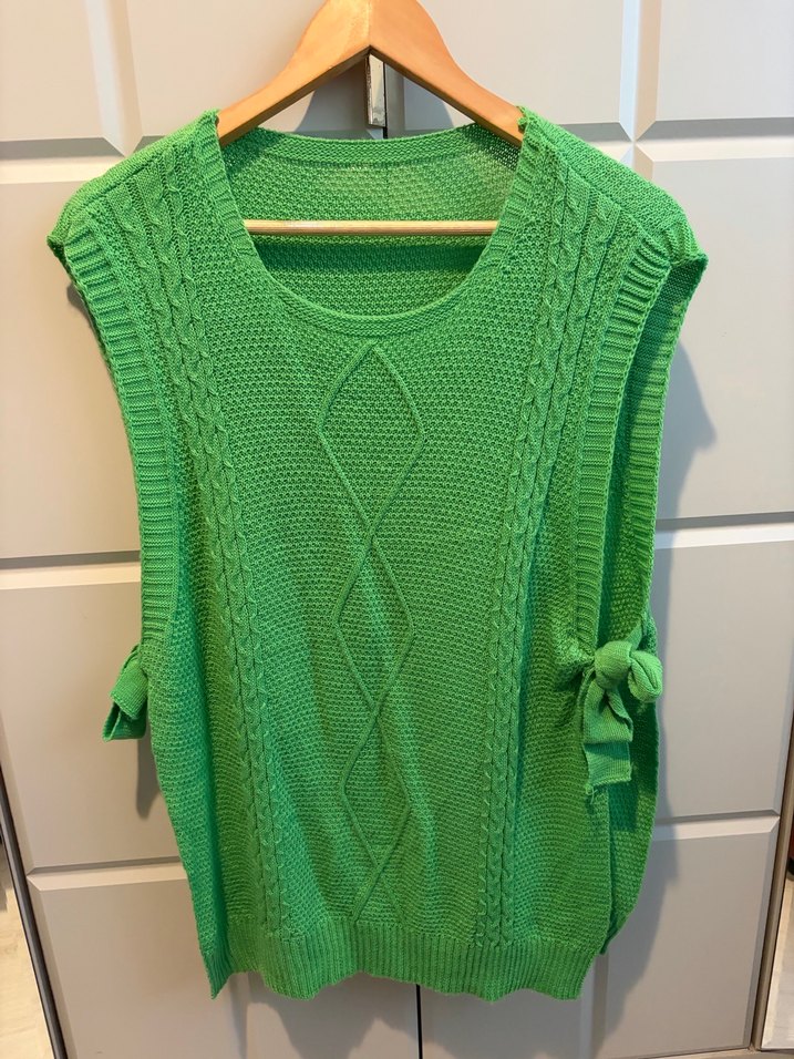 Yeşil renkli, örgü dokulu, kolsuz süveter. Yuvarlak yaka ve bol kesim ile rahat bir görünüm sunar. Yanlarda fiyonk detayları bulunur.