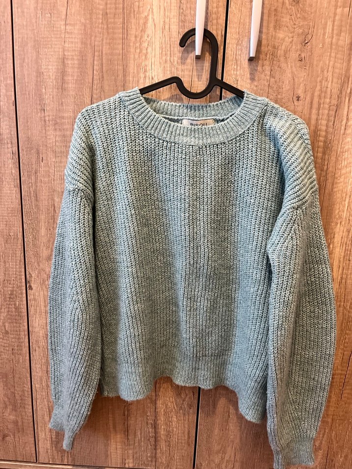Yeşil örgü triko kazak, yuvarlak yaka ve uzun kollu, bol kesim rahat günlük kullanım için normal boyda.