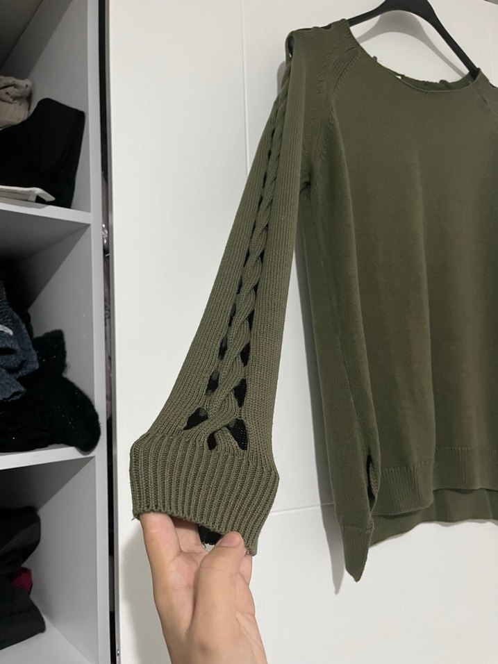 Kolları örgü desenli yumuşak dokulu kazak Sadece ürünün ense kısmında tin kaçması var oda etiketini keserken oldu başka sıkıntısı yoktur