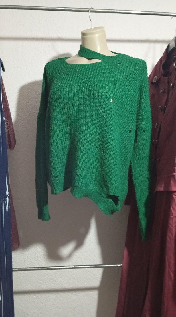 Yeşil örgü kumaştan, uzun kollu, yuvarlak yakalı ve bol kesim rahat bir kadın kazak. Günlük kullanıma uygun, parlak örgü dokusuyla sokak tarzı sağlar.