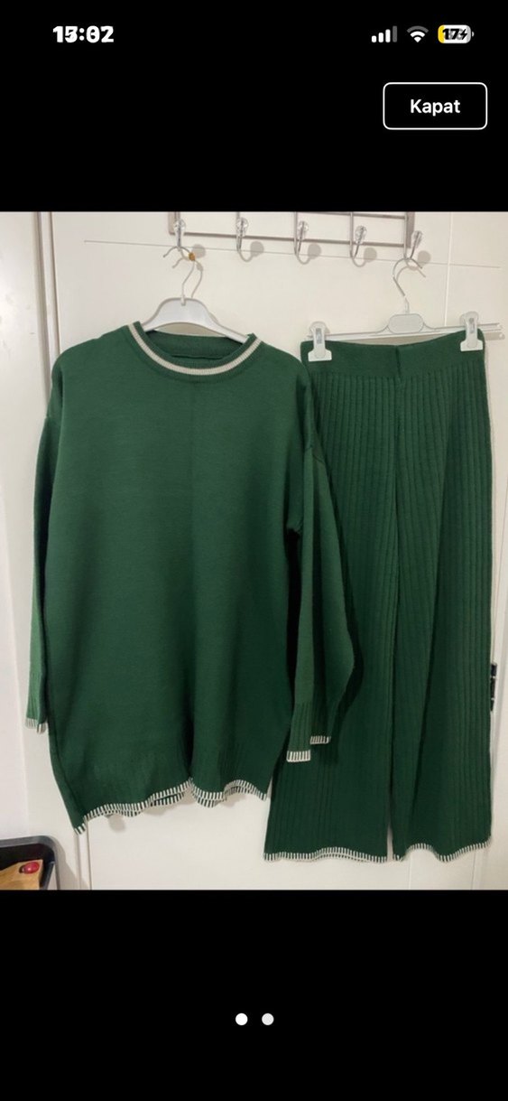 Uzun boy, salaş kesim, koyu yeşil örgü kazak. Bisiklet yaka ve uzun kollu, rahat günlük kullanıma uygun.