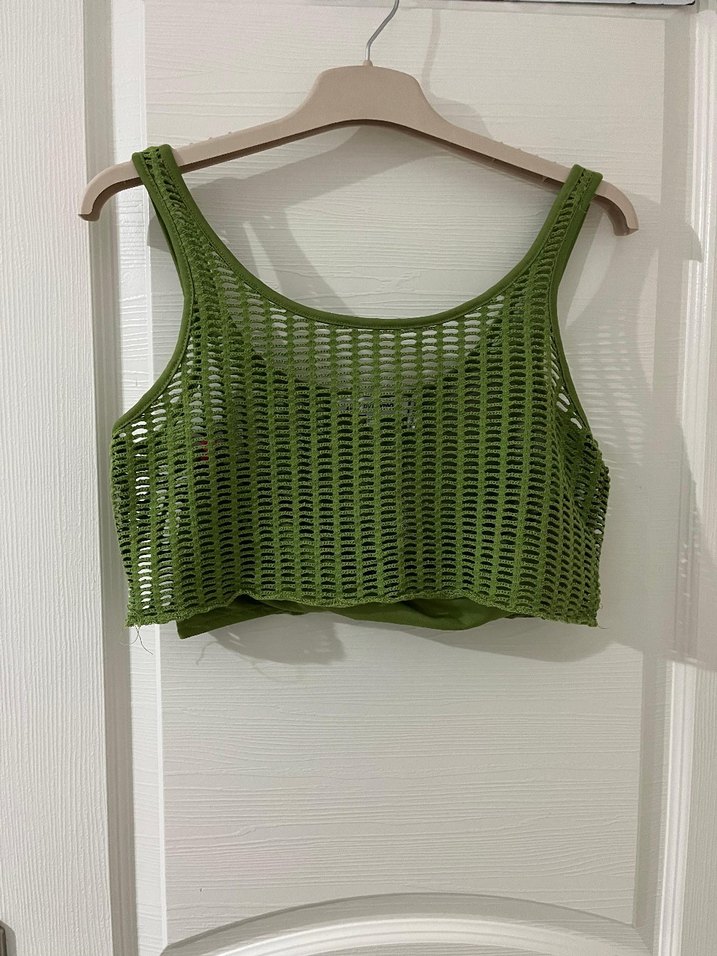Sentetik kumaştan, ince askılı, tek renk yeşil örgü crop top. Spor ve sokak tarzı için uygun, vücuda oturan kesim.