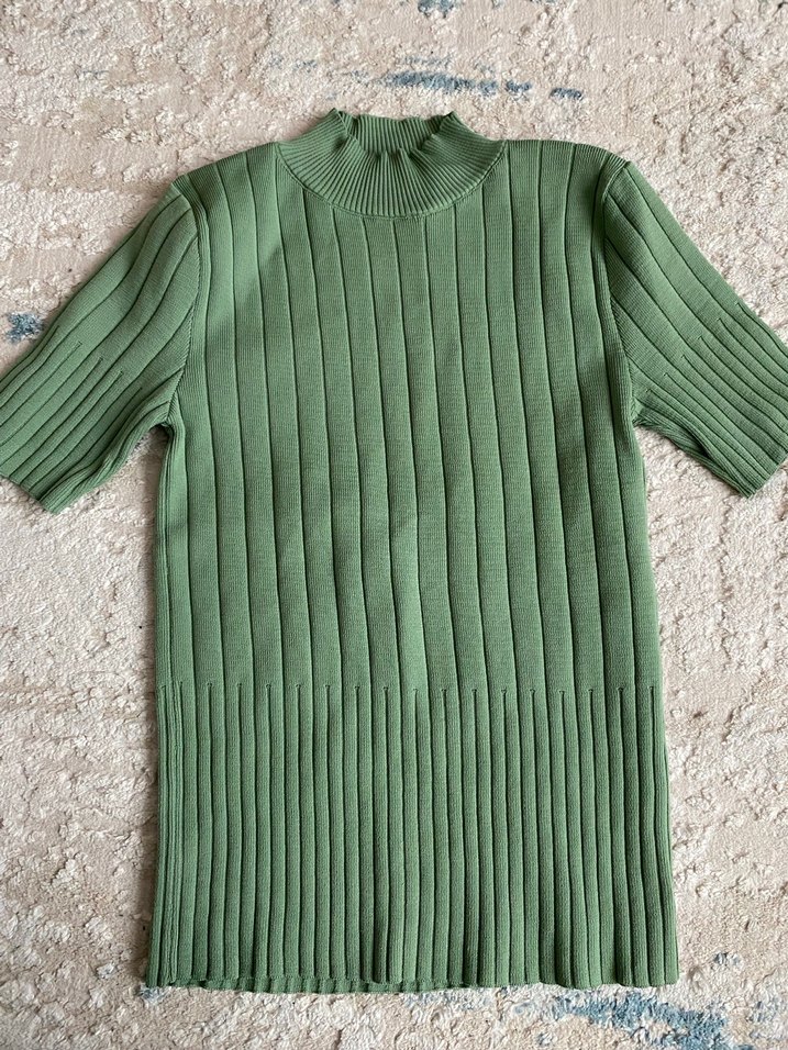 Bu yeşil, örgü kumaştan yapılmış kazak, boğazlı ve kısa kolludur. Normal midi boyunda ve fit kesimlidir, rahat kullanım için uygundur.