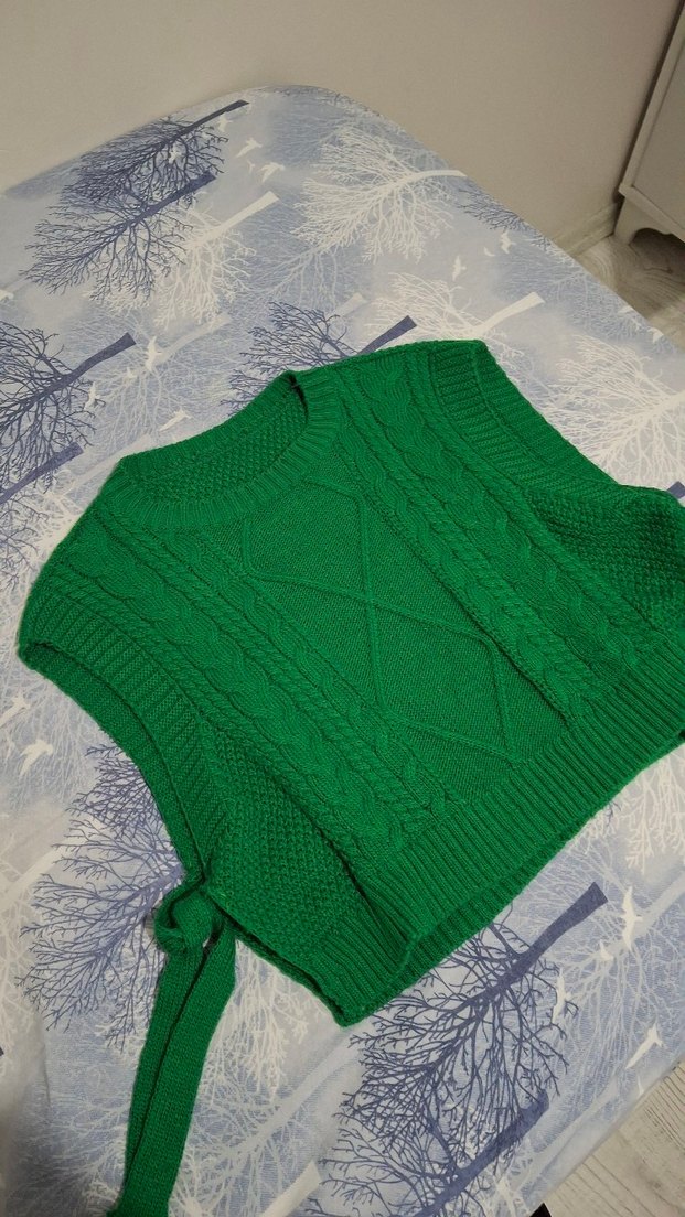 Yeşil renkli, örgü kumaştan yapılmış kolsuz balıkçı yaka süveter. standart bedendir bir defa kullanılmıştır kusursuzdur.