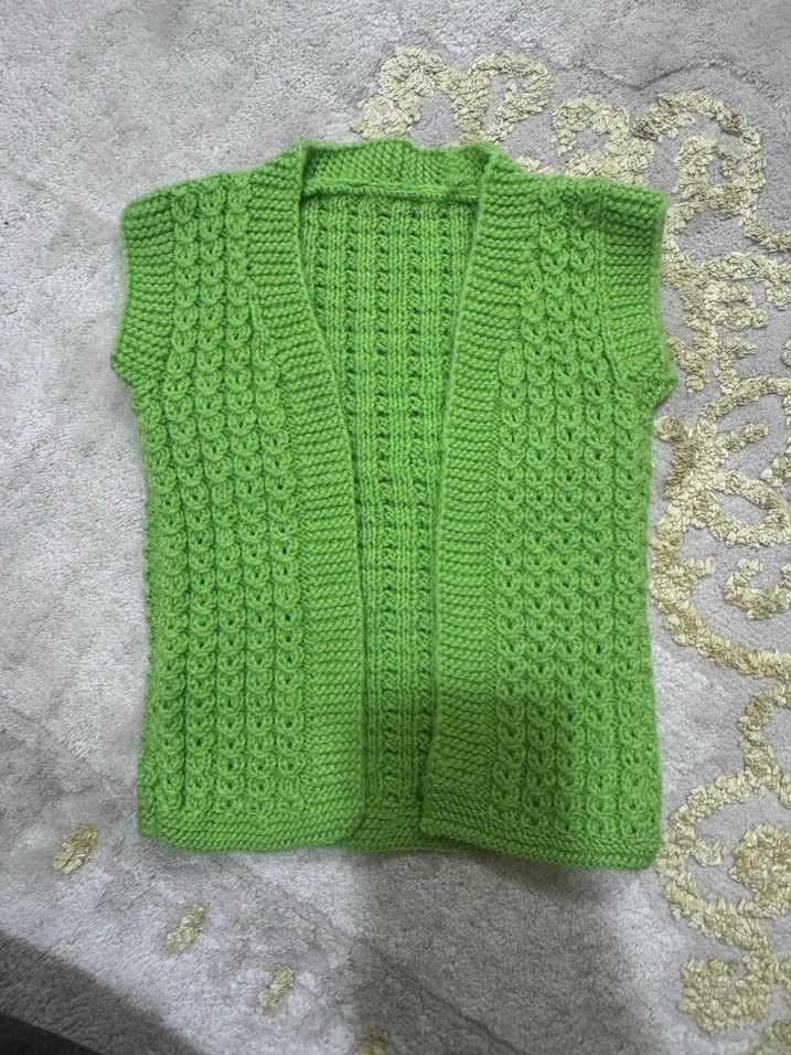 Canlı yeşil renkte, kısa ve kolsuz, örgü dokulu bebek yelek.Hic giyilmedi.Dügme yerleri yok.Cıtcıt basılabilir veya dügme yeri yapabilirsiniz