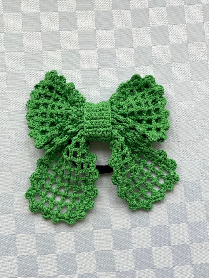Yeşil renkli, örgü kumaştan yapılmış fiyonk şeklinde, vintage ve klasik tarzda kadın saç tokası.