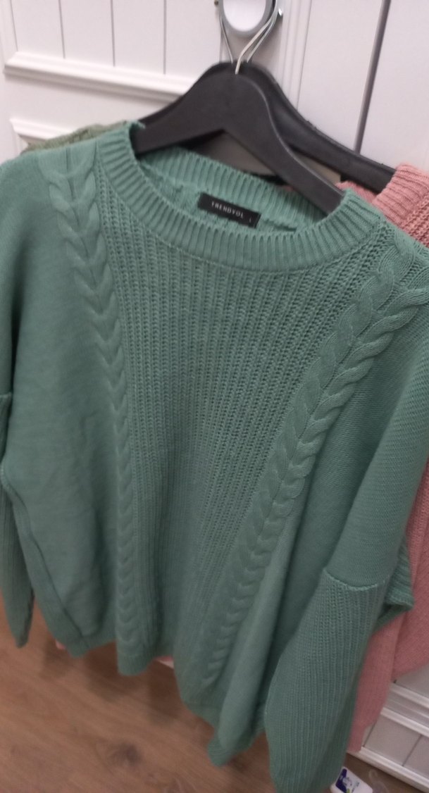 Pastel yeşil renkte, örgü kumaştan, yuvarlak yakalı ve uzun kollu, salaş kesim kadın kazak, rahat ve sıcak bir stil sunar.