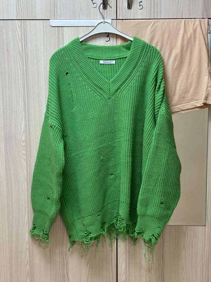 Canlı yeşil renkli, örgü triko kazak. Salaş kesim, yuvarlak yaka ve uzun kolludur. Yıpranmış, püsküllü detaylarla trend bir görünüm sunar. oversze