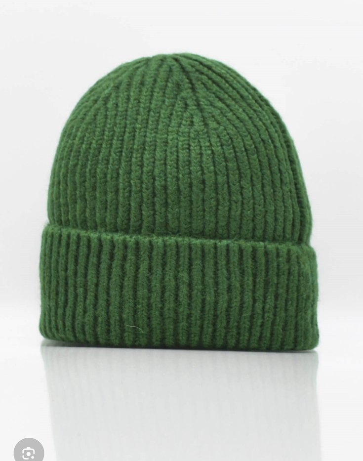 Yumuşak yünden örülmüş, canlı yeşil renkte kadın bere, rahat ve sade bir tarz sunar.