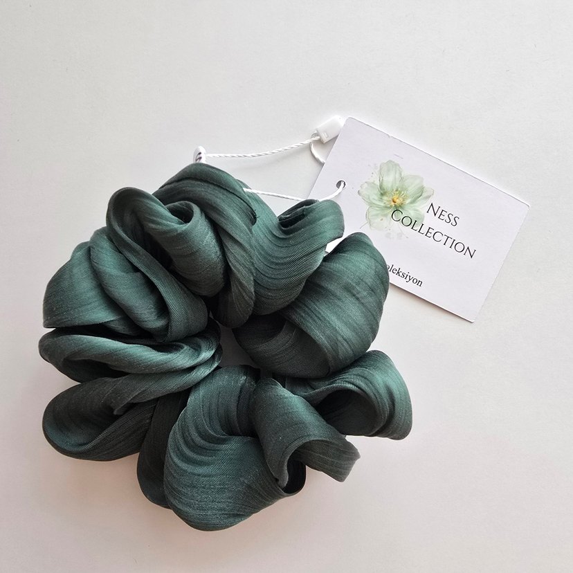 Yeşil renkli, ipek görünümlü lastikli saç tokası. Bohem ve avangart tarzı bir araya getiriyor. NESS Collection ürünüdür.