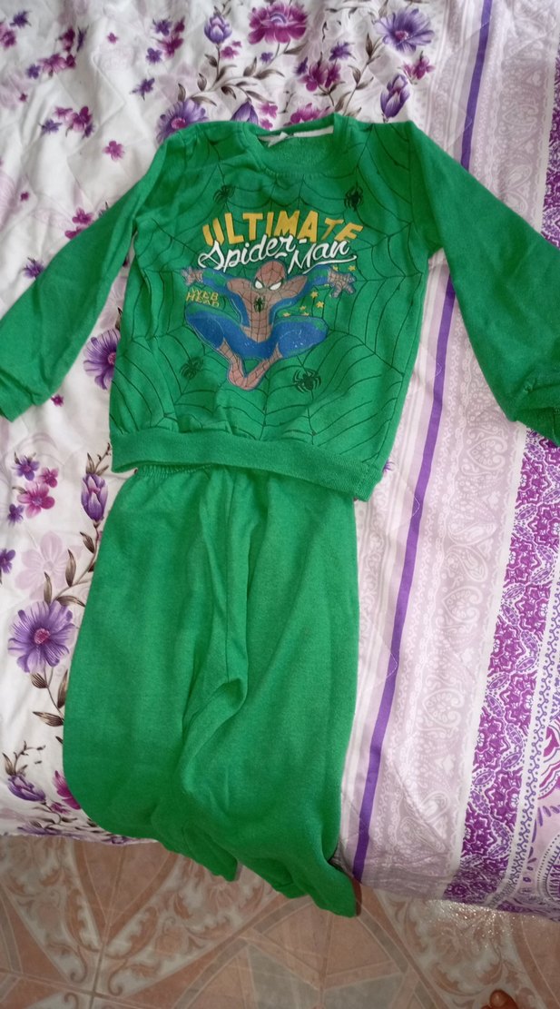 Yeşil renkli, örme kumaştan yapılmış, bol kesim çocuk takımıdır. Uzun kollu, bisiklet yaka ve renkli baskılı Spider-Man desenlidir. 10 yaş yazıyor ama 5 yaşındaki çocuk giyiyor