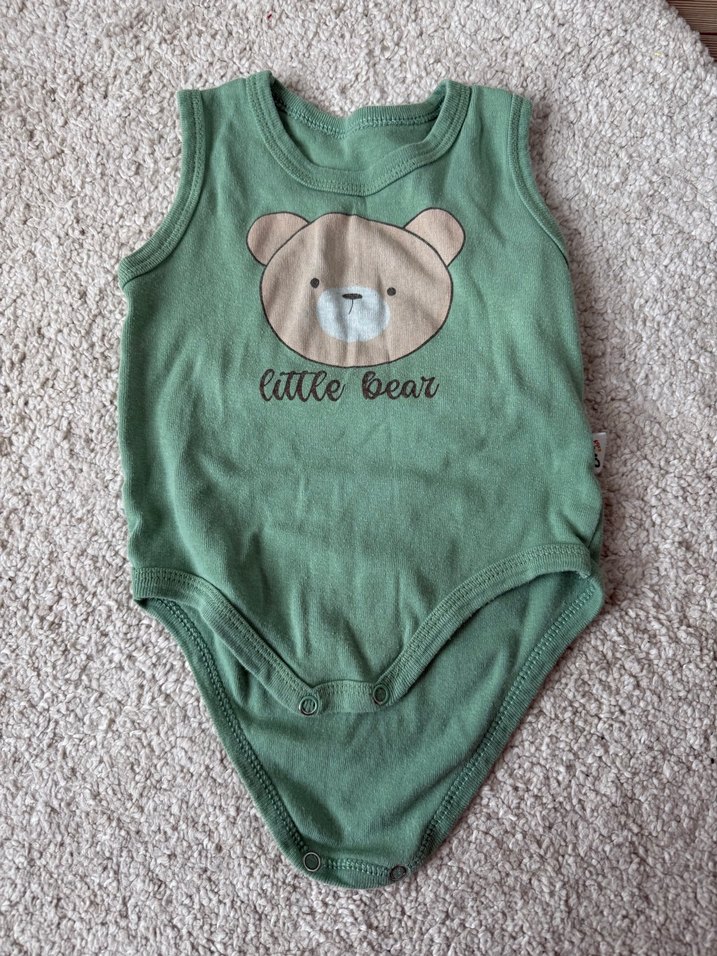 Kolsuz, yuvarlak yakalı yeşil örme bebek body, yumuşak dokulu kumaş ve önünde ayı baskısı bulunur.