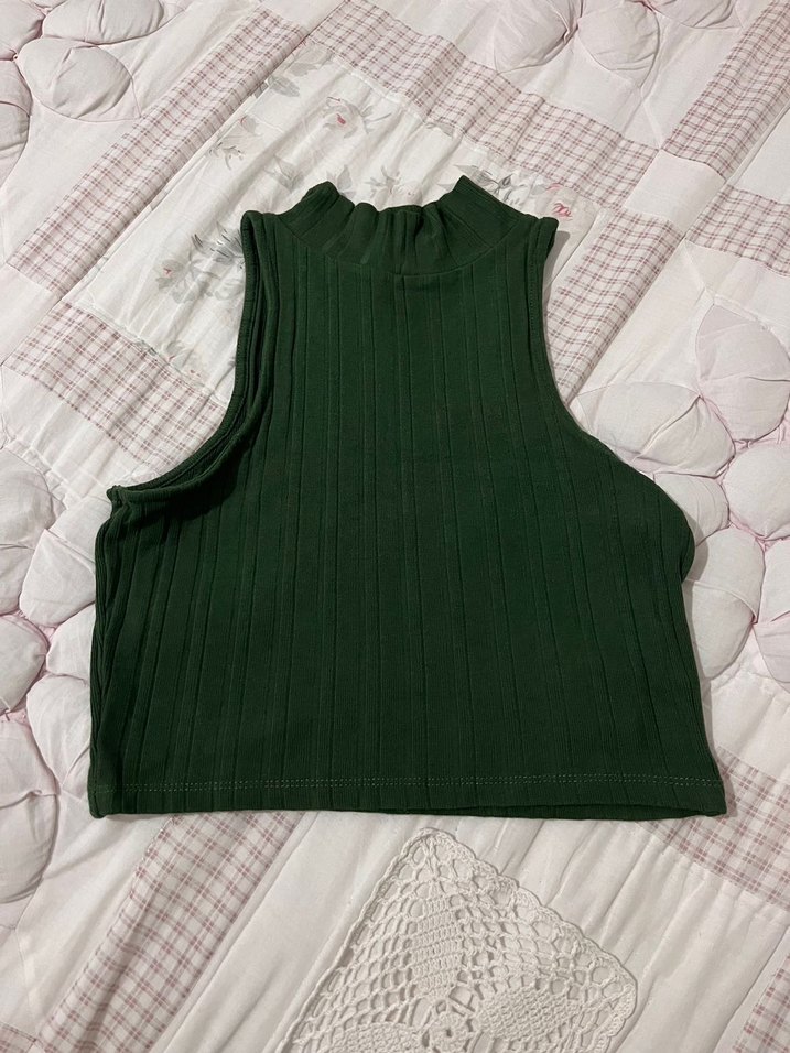 Koyu yeşil, örme dokulu, boğazlı ve kolsuz crop top, günlük kullanıma uygun, sokak stilinde ve vücuda oturan kesimde.