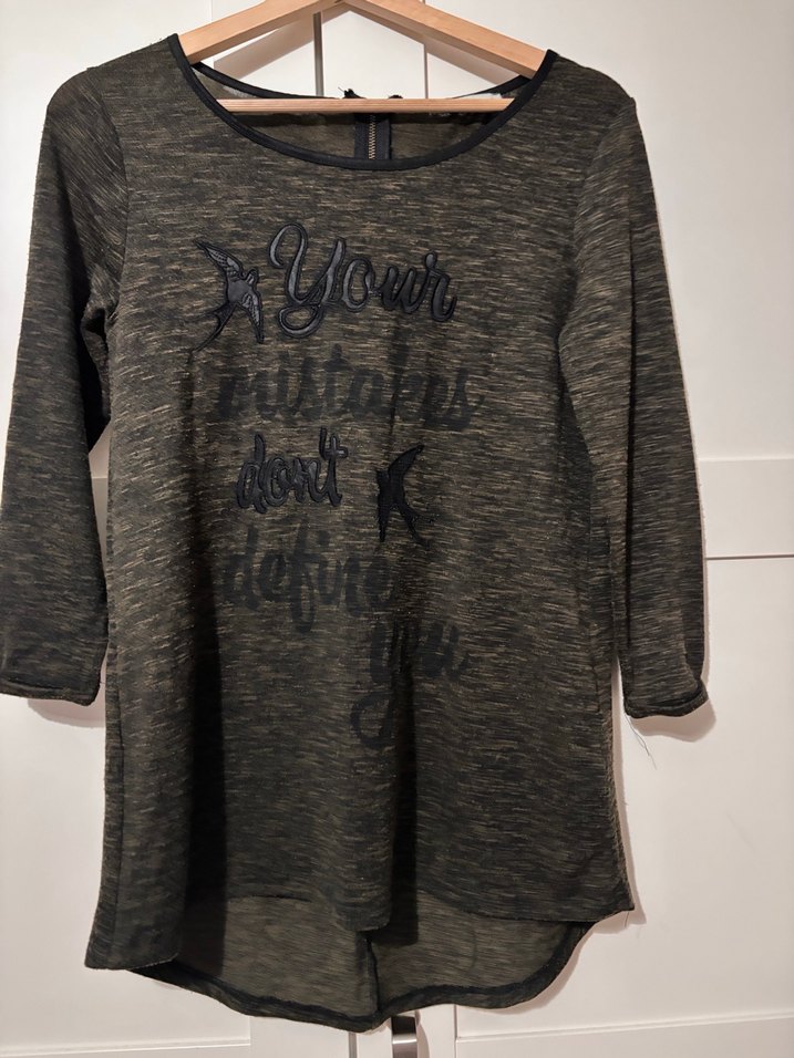 Yeşil örme tunik, yarım kollu, yuvarlak yakalı ve bol kesimdir. Yumuşak örme kumaştan yapılmış, baskılı desenli ve midi boydadır.