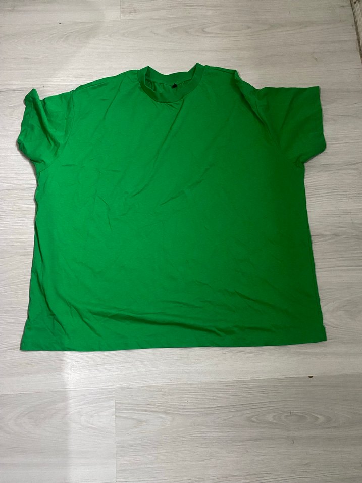 Yuvarlak yaka ve kısa kollu, oversize kesim erkek tişörtü. Yumuşak sentetik kumaştan yapılmış, sade ve renkli yeşil tasarıma sahiptir.