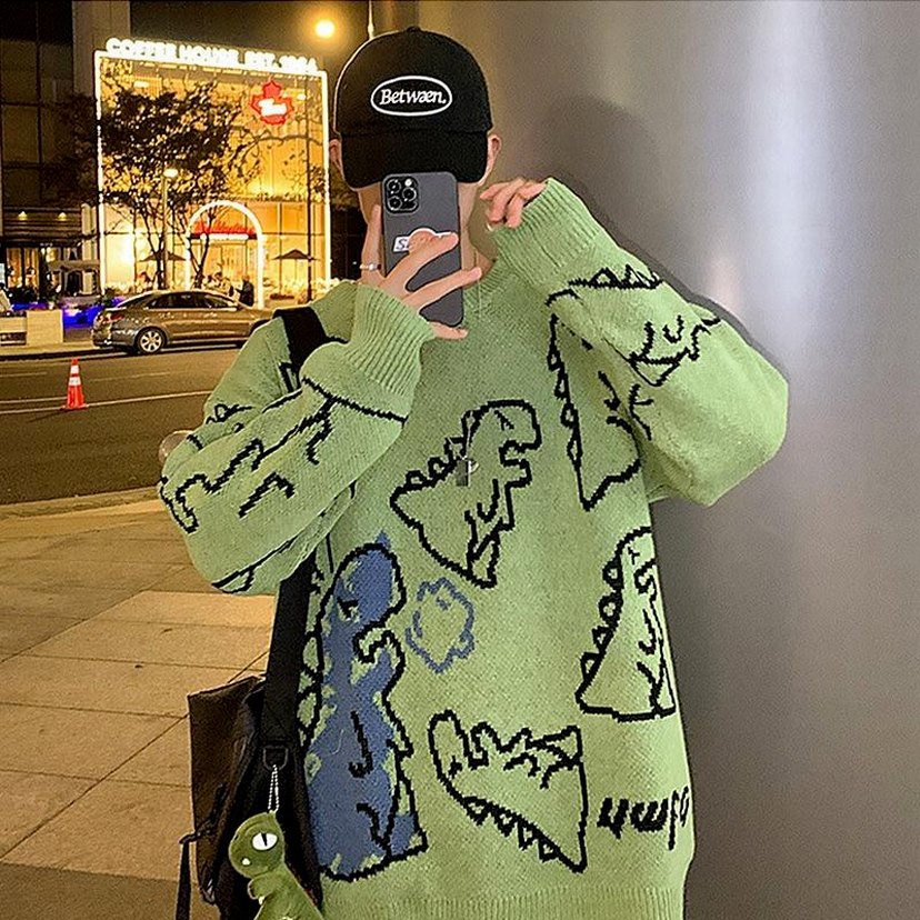 Yeşil Oversize Dinozor Desenli Triko Kazak