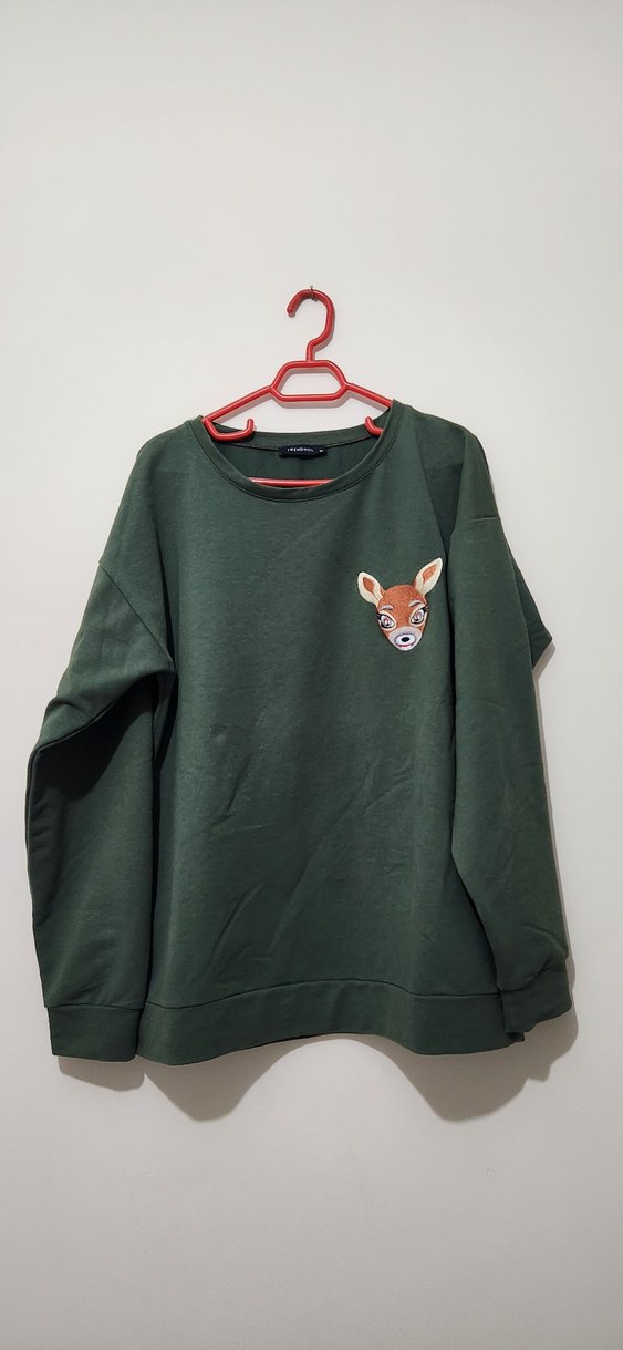 Koyu yeşil renkte, yuvarlak yakalı ve uzun kollu, rahat kesim kadın sweatshirt. Yumuşak ve sıcak kumaştan üretilmiş, küçük geyik baskılı, gündelik şıklık sağlar.