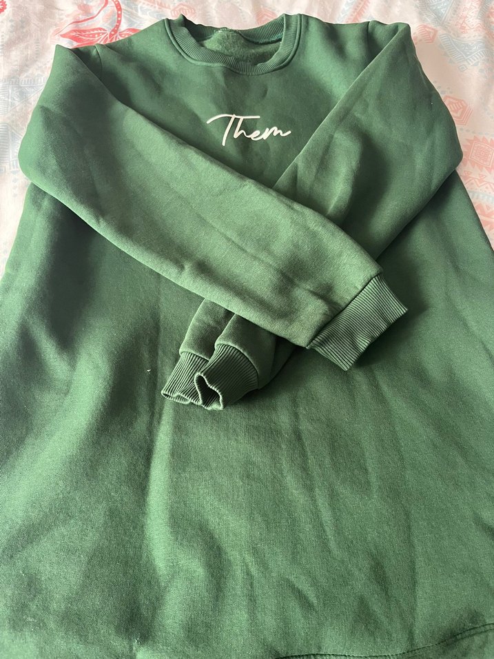 Yeşil renk, uzun kollu, yuvarlak yaka ve bol kesime sahip sweatshirt. Dökümlü tarzda, parlak dokulu ve desensiz kumaştan üretilmiştir. Rahat ve gündelik kullanım için uygundur. Bir kere kullanıldı