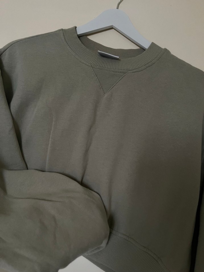 Kadınlar için yeşilin tonu açık haki gibi , oversize kesim, yuvarlak yakalı, uzun kollu sweatshirt. Sentetik kumaştan, sade ve desensiz, günlük sokak stili için uygun.