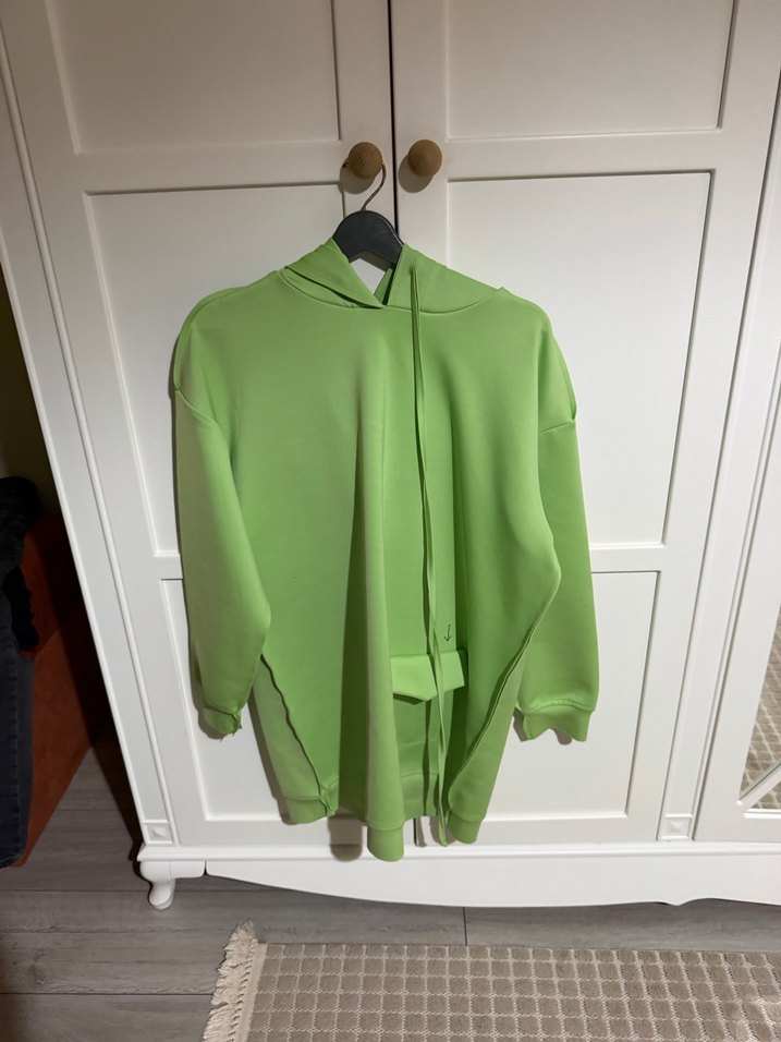 Pastel yeşil renkli, oversize kesim, uzun kollu, yuvarlak yakalı kısa uzunlukta sweatshirt. Minimalist tasarımıyla rahat ve şık bir görünüm sunar.