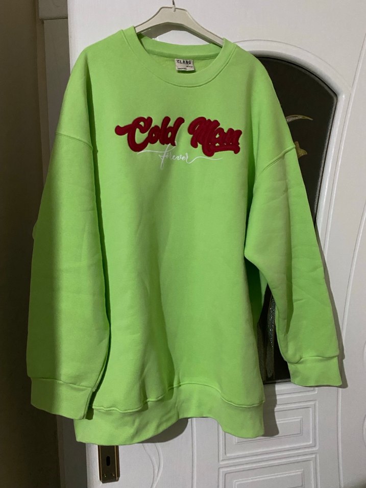 Yeşil renkli, uzun kollu, yuvarlak yaka ve bol kesim sweatshirt. Yumuşak kumaş üzerine nakışlı baskı detaylarıyla rahat ve günlük kullanıma uygun.