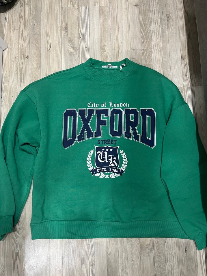 Yumuşak fleece kumaştan, uzun kollu ve yuvarlak yakalı, bol kesim yeşil sweatshirt. Oxford baskılı rahat ve şık sokak stili için uygundur.