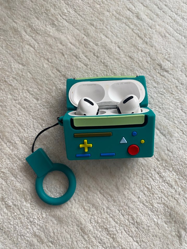 Airpods Pro Uyumlu Yeşil, renkli oyun konsolu şeklinde kablosuz kulaklık kılıfı. Kontrol düğmeleri ve anahtarlık aparatı bulunur .