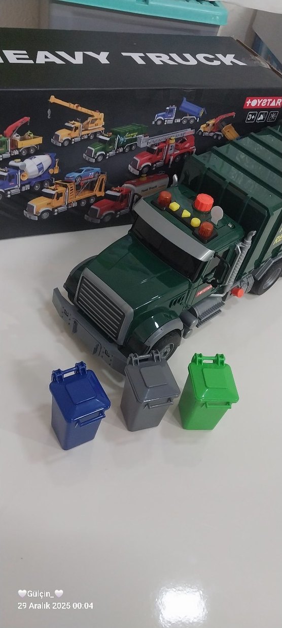 Yeşil oyuncak çöp kamyonu, mavi, gri ve yeşil renkli üç çöp kutusuyla birlikte. Kamyon detaylı ışıklara ve gerçekçi tasarıma sahip.