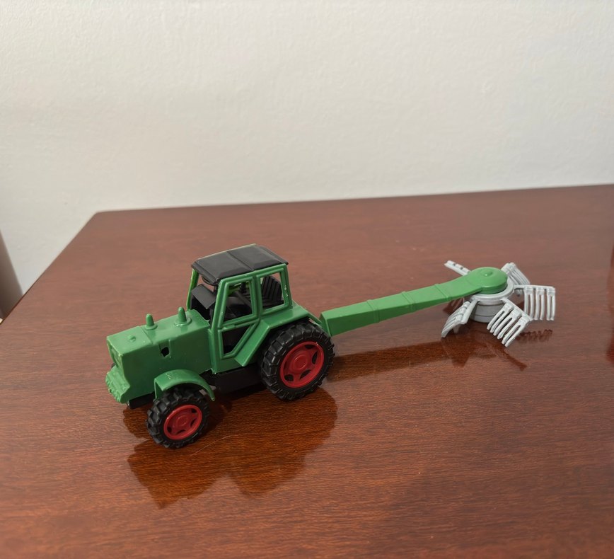 Kırmızı tekerlekli, arka kısmı uzatılmış yeşil oyuncak traktör.