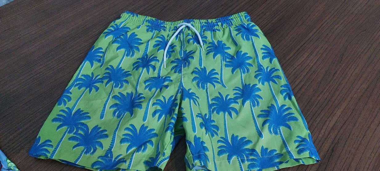 Yeşil zemin üzerine canlı mavi palmiye desenleri ve ayarlanabilir ipli bel bandı bulunan erkek çocuk deniz şortu.
