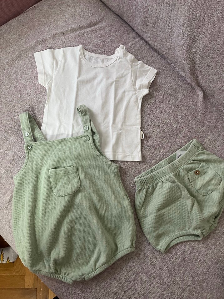 Beyaz kısa kollu tişört, pastel yeşil pamuklu tulum ve şorttan oluşan yumuşak ve şık bebek erkek takımı.