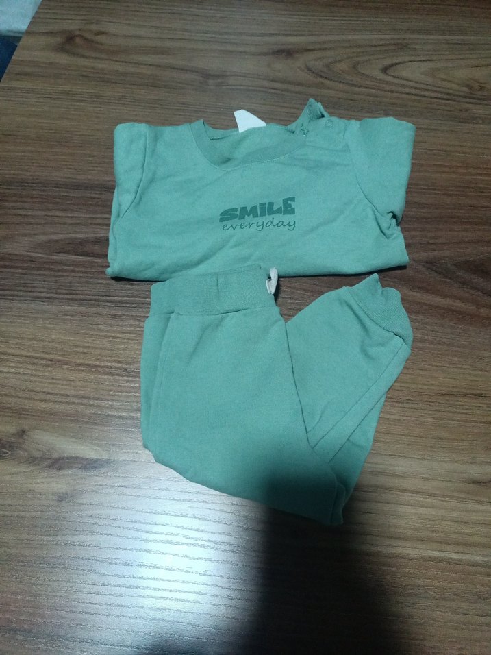 Pastel yeşil renkte, uzun kollu ve yuvarlak yakalı, yumuşak ve sıcak kumaştan bebek erkek takımı. Üzerinde 'SMILE everyday' baskısı bulunur.