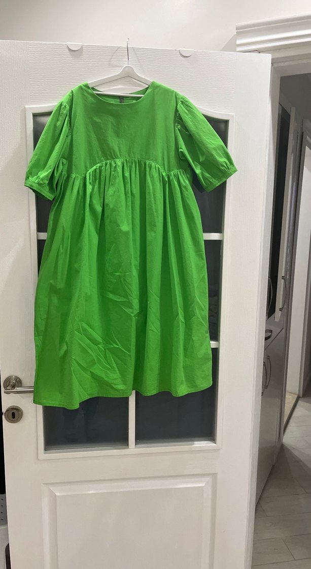 Keten kumaştan yapılmış, kısa kollu, yuvarlak yakalı, bol kesim yeşil midi elbise. Dökümlü tasarımı ve parlak görünümü ile günlük kullanıma uygun. Pamuk poplin kumaş astarlıdır Kız Çocuk 11 12 yaş