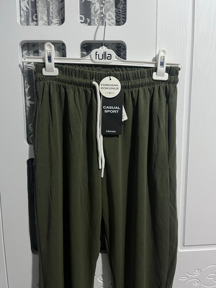 Yumuşak pamuklu kumaştan, elastik bel detaylı, rahat kesim ve midi boy, koyu yeşil kadın eşofman pantolonu.