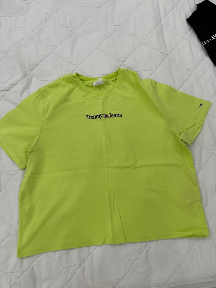 Kısa kollu, yuvarlak yakalı ve bol kesim tişört Pamuklu, pastel yeşil renkte, önünde Tommy Jeans baskısı bulunur.