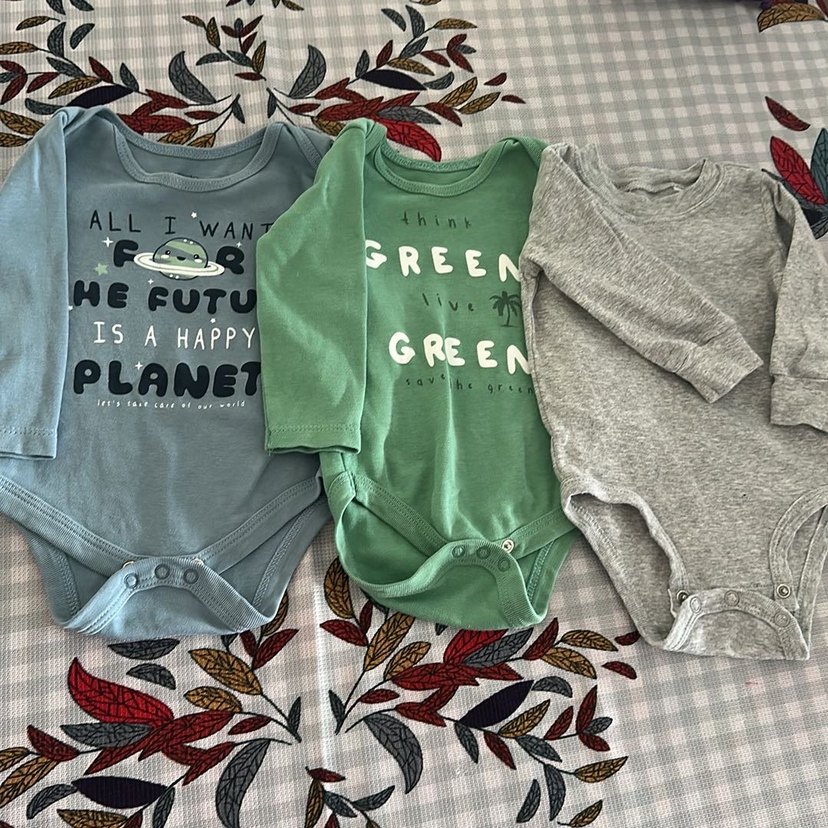 Yeşil renkli, uzun kollu ve bisiklet yaka bebek body. Pamuklu, örme dokulu ve baskılı tasarıma sahiptir.üçlü fiyatıdır