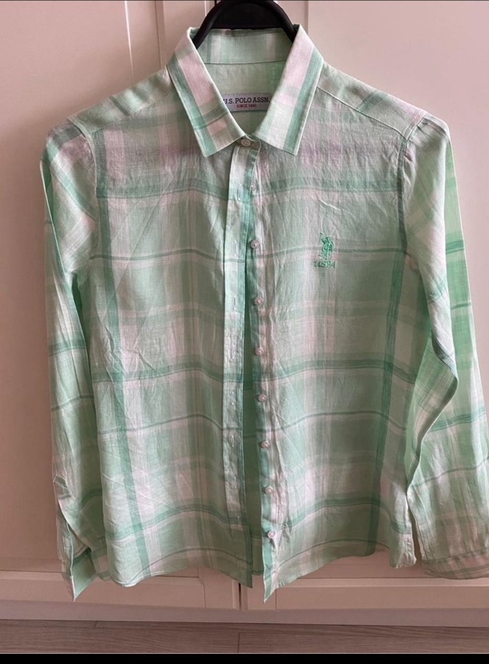 Uzun kollu, düğmeli, yakalı kadın gömleği. Hafif keten kumaştan, regular fit, pastel yeşil tonlarda batik desenli, günlük sokak stiline uygun.