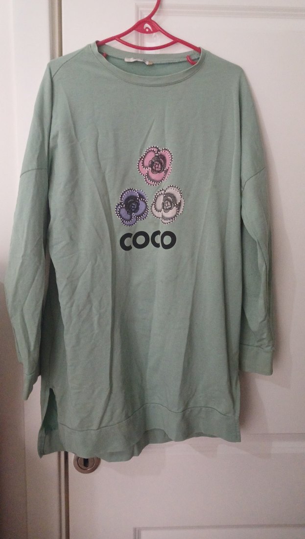 Yumuşak pamuktan, uzun kollu, bol kesim yeşil sweatshirt. Yuvarlak yaka ve düğme detaylı, pastel çiçek baskılı rahat bir model küçük bir leke var belirttim yıkayınca çıkar fiyatını ona göre belirttim