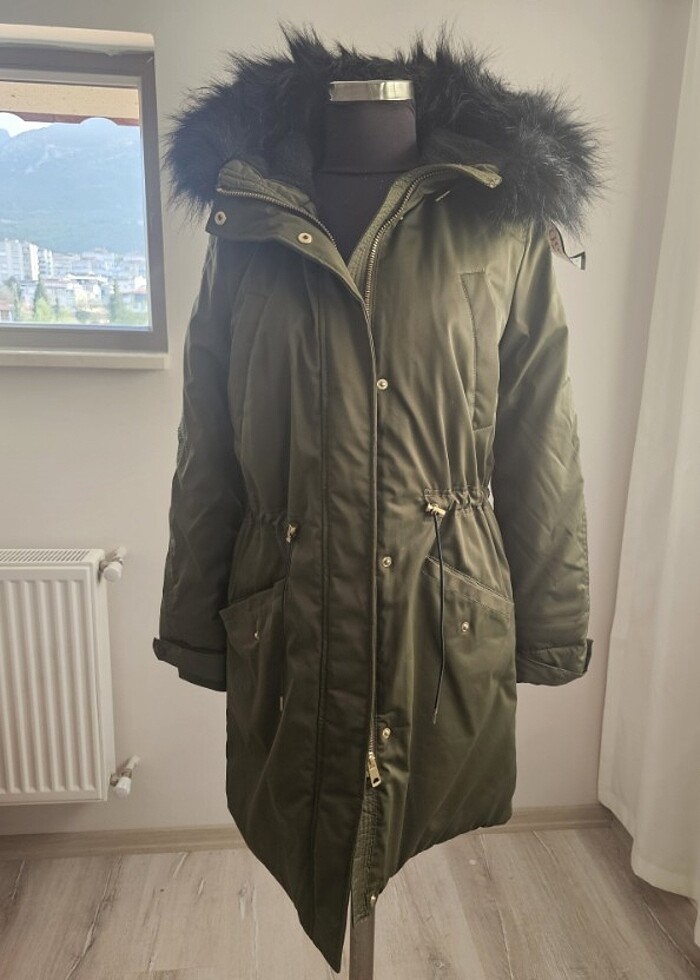 Yeşil parka etiketli xs yakası kürklü
